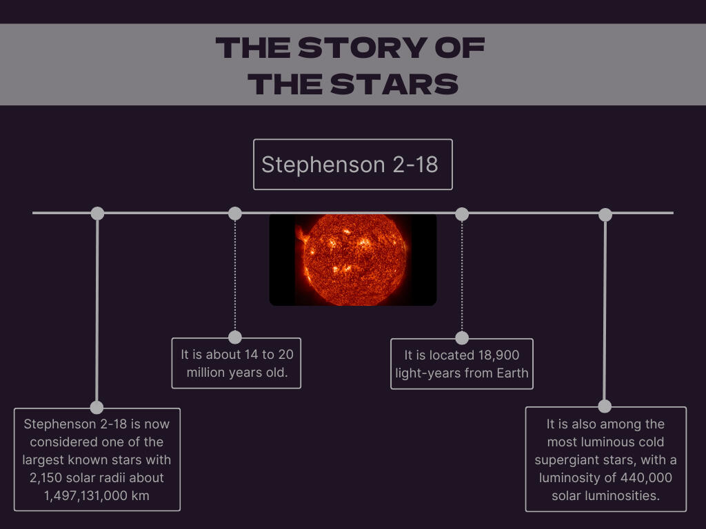 Stephenson 2-18 has an incredible 2,150 times the radius of the Sun. It occupies an area of 1.8' of the sky, is not visible to the naked eye because it is heavily obscured by dust, but can be seen in infrared light. It is located in the constellation of Scutum, 18,900 light-years from us, in the region of the sky between Alpha and Beta Scuti. At about 14 to 20 million years old it can continue to grow, and possibly one day it will become a yellow hypergiant.